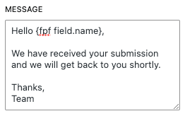 By default, the Message will contain the {fpf all_fields} Smart Tag, which displays all user-entered fields plus hidden fields and their labels.