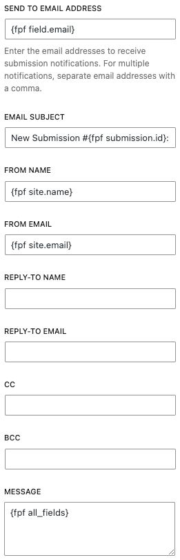 By default, the Send To Email Address will be set to the {fpf site.email} Smart Tag, which pulls the administrator email from your WordPress settings. However, you can replace this or add additional emails if you’d like.